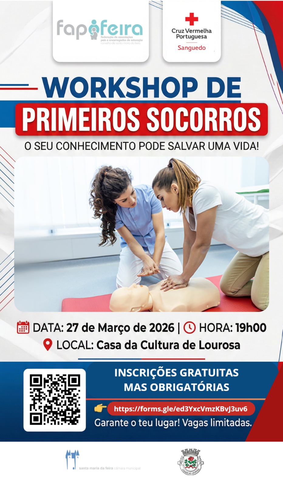 No passado dia 27 de março, a Fapfeira, em parceria com a Cruz Vermelha Portuguesa de Sanguedo, dinamizou o Workshop em "Primeiros Socorros". O Workshop foi realizado no Salão Polivalente da Junta de Freguesia de Lourosa, do qual agradecemos a prontidão e disponibilidade em nos receber. Esperemos que tenha sido do agrado de todos os participantes. Um agradecimento especial à Cruz Vermelha Portuguesa de Sanguedo.