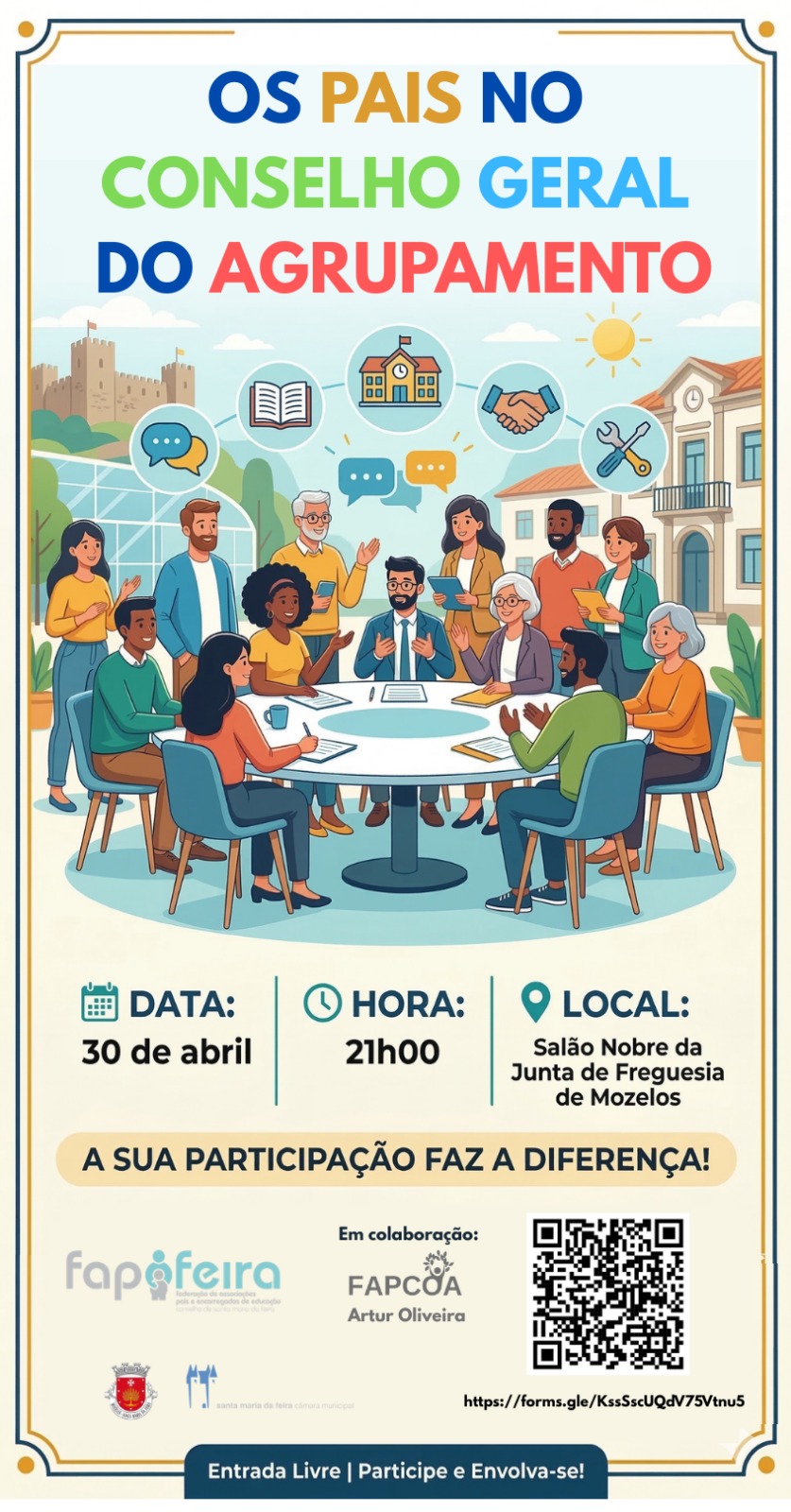 No próximo dia 30 de abril, pelas 21 horas, no Salão Nobre da Junta de Freguesia de Mozelos, a Fapfeira irá realizar uma sessão de esclarecimento subordinado ao tema "Os Pais no Conselho Geral do Agrupamento". Será realizado com a colaboração da FAPCOA. Aos pais que estejam interessados em aprofundar o conhecimento do funcionamento dos Conselhos Gerais, não perca esta oportunidade. Inscreva-se As vagas são limitadas.